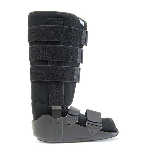 Κατασκευή από σταθερό και άκαμπτο πλαστικό υλικό. Διαθέτει προσθαφαιρούμενη και αυτοκόλλητη αφρώδη επένδυση (foam), η οποία καλύπτει εσωτερικά όλη την επιφάνεια της ποδοκνημικής. Είναι υποαλλεργική και αντιεφιδρωτική. Φέρει δύο αμφίπλευρες μπανέλες αλουμινίου, πολύ ισχυρές, σταθεροποίησης του άκρου ποδός. Τέσσερεις αυτοκόλλητοι ιμάντες περίδεσης. Σόλα με ανατομικό σχεδιασμό “ROCKER BOTTOM” για την απορρόφηση των κραδασμών. Επίσης διαθέτει βαλβίδα εισαγωγής-εξαγωγής αέρα (in-out) για μείωση και αποθεραπεία του οιδήματος.