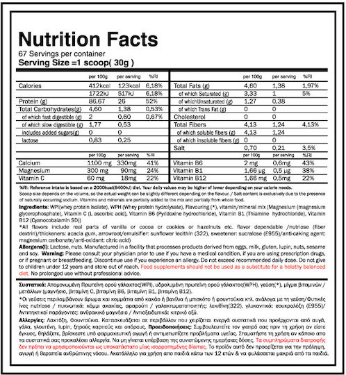 Αρχικά, η φόρμουλα περιλαμβάνει 85% Whey Protein Isolate (WPI 95) και 10% Hydrolyzed Whey Protein (WPH 86). Το whey isolate περνά πολλαπλά στάδια φίλτραρίσματος, επομένως αφαιρούνται σε μεγάλο βαθμό λιπαρά, χοληστερόλη και λακτόζη. Έτσι, προκύπτει καθαρή πρωτεΐνη υψηλής συγκέντρωσης που υποστηρίζει αποτελεσματικά τη μυϊκή ανάπτυξη.